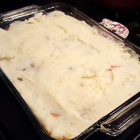 5. Pour beef filling into an ungreased 9 x 13 casserole dish. Top with mashed potatoes. Spread mashed potatoes so that they evenly cover the entire dish.